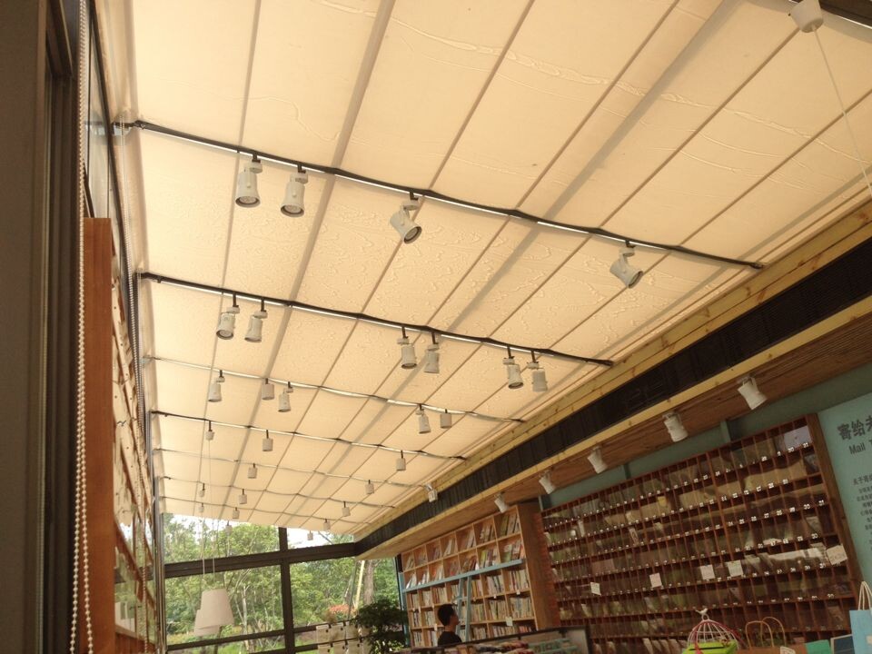 天空之城全玻璃陽光房的造型,比較簡潔,但是在烈日炎炎夏天,依舊考驗(yàn)不小。為此,專門為天空之城私人定制了遮陽方案。在玻璃頂面,采用軌道式的天棚簾遮陽,門口,一排遮陽棚,整齊如一的打開。在天氣炎日的時(shí)候,天棚簾加室內(nèi)中央空調(diào),人性化的遮陽設(shè)計(jì),給予讀者創(chuàng)造一個(gè)溫馨舒適的讀書環(huán)境。